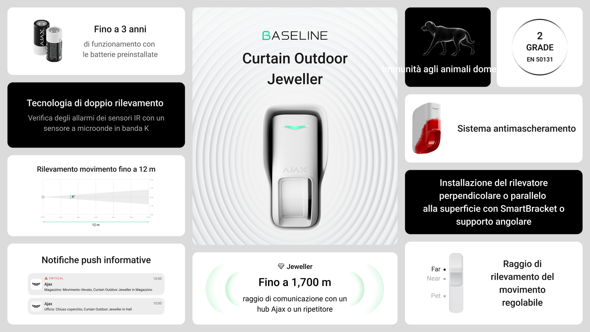 • Batteria a Lunga Durata: Grazie al basso consumo energetico, Curtain Outdoor Jeweller garantisce 3 anni di operatività senza bisogno di manutenzione frequente.